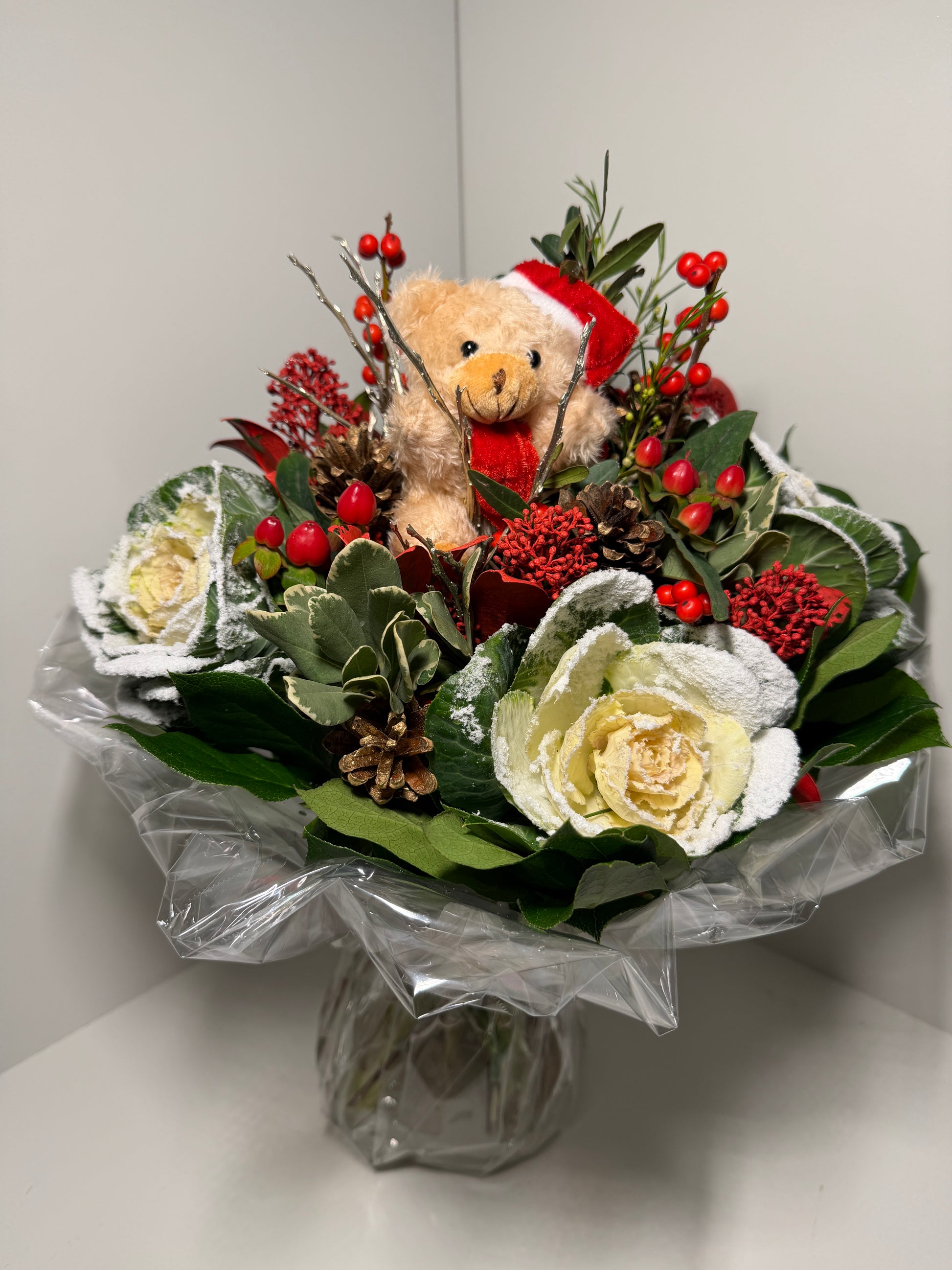 Au cœur du bouquet, un ours en peluche coiffé d’un bonnet de Noël apporte une touche chaleureuse et attendrissante.