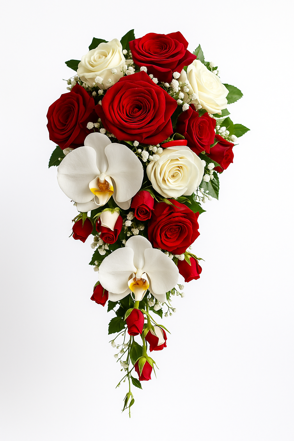 Superbe bouquet de mariée en cascade, mêlant roses rouges passionnées, roses blanches délicates et orchidées blanches élégantes. Agrémenté de gypsophile et de feuillage léger, il symbolise l’amour profond, la pureté et l’élégance intemporelle. Sa forme tombante apporte une touche majestueuse et raffinée, idéale pour sublimer une tenue de mariage avec grâce.