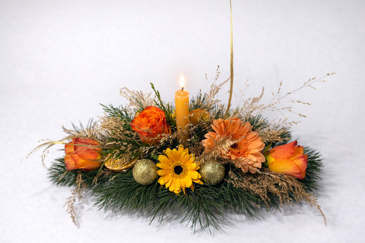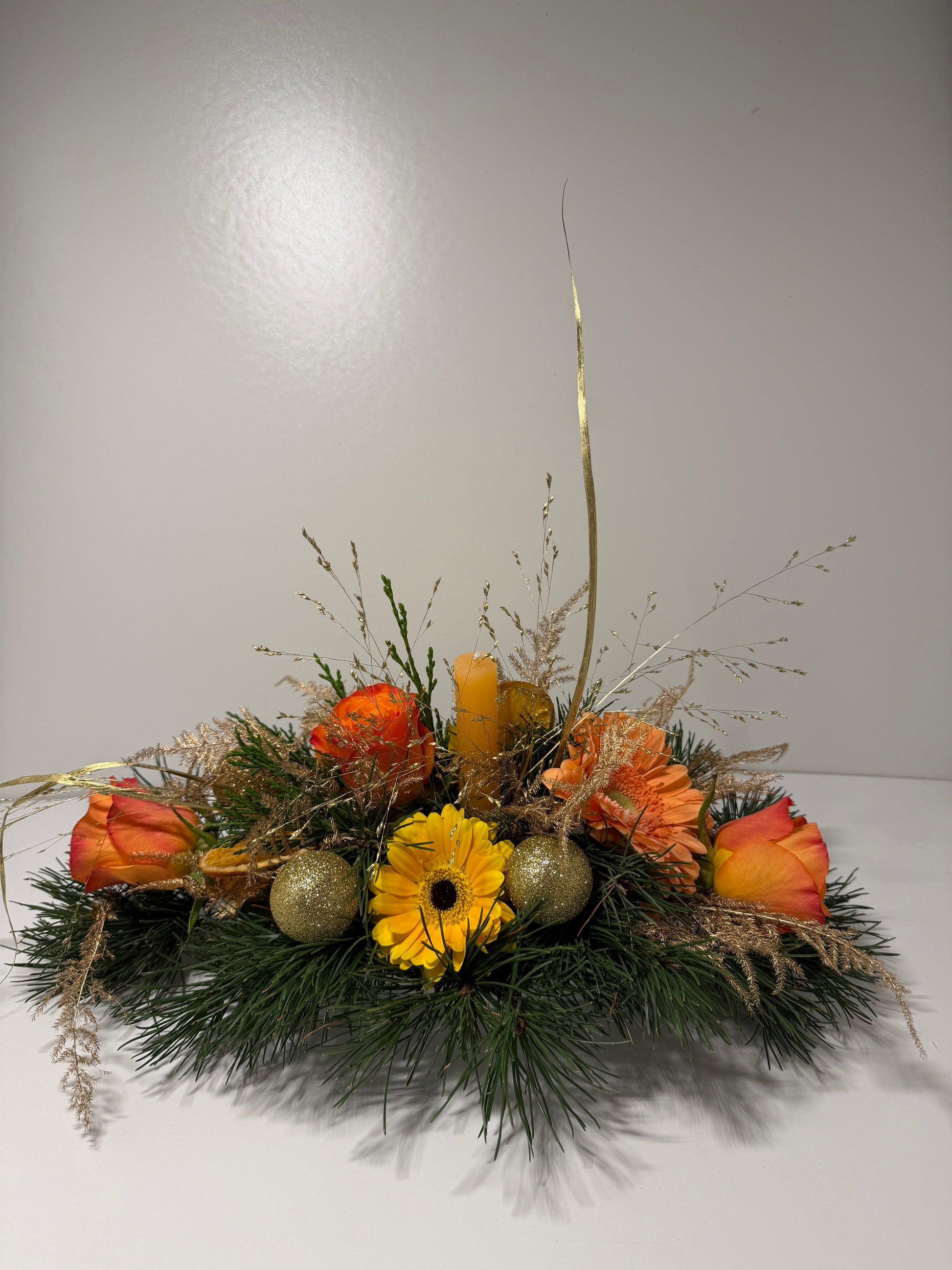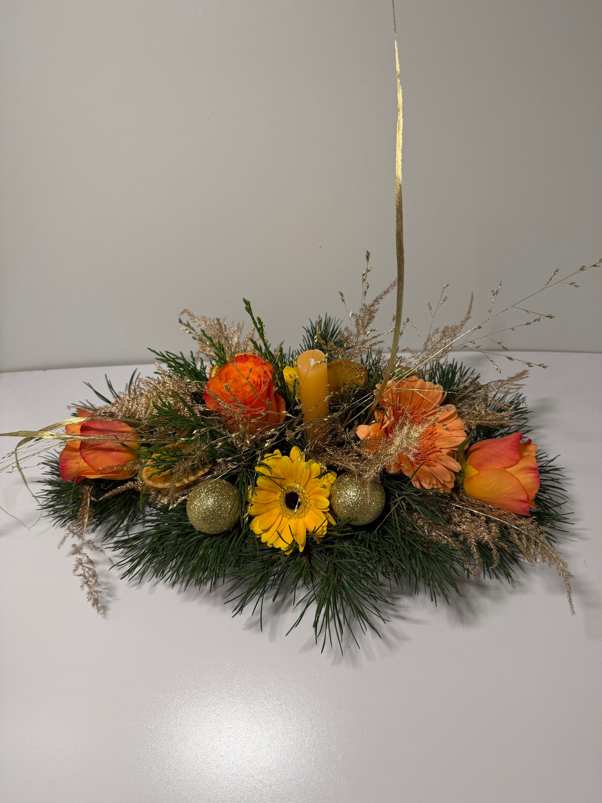 Apportez une touche chaleureuse et élégante à vos fêtes avec ce centre de table floral aux nuances orangées et dorées. Réalisée à la main par nos fleuristes, cette composition associe harmonieusement fleurs fraîches, feuillages de saison et éléments décoratifs festifs, pour un rendu à la fois naturel et raffiné.
