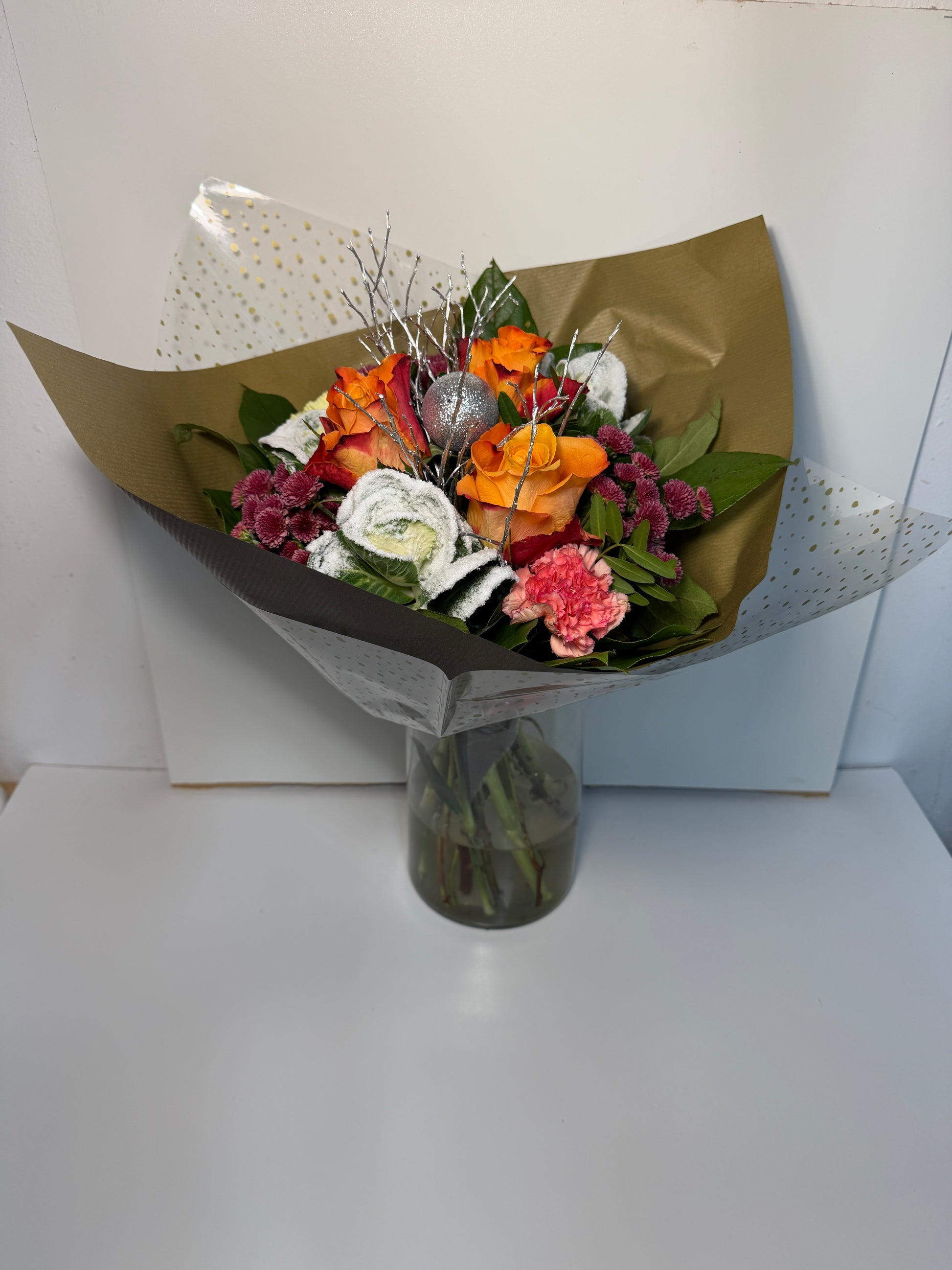 Le bouquet Chaleur d’Hiver est une création florale généreuse et élégante, qui mêle avec subtilité des teintes chaudes et des touches hivernales raffinées.