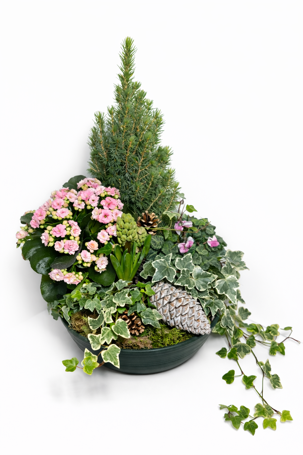 Cette composition végétale décorative marie harmonieusement un jeune conifère naturel, symbole de longévité, à des fleurs roses délicates apportant douceur et fraîcheur. L’ensemble est complété par un mélange de feuillages verts et panachés, créant un contraste élégant et équilibré.