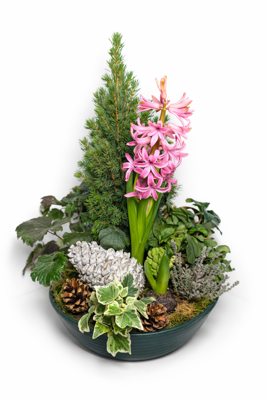 Cette composition végétale hivernale associe harmonieusement une jacinthe rose parfumée, symbole de douceur et de renouveau, à un jeune conifère vert, apportant structure et longévité à l’ensemble. Le tout est sublimé par différents feuillages décoratifs, de la mousse naturelle et des pommes de pin aux nuances naturelles et blanchies.