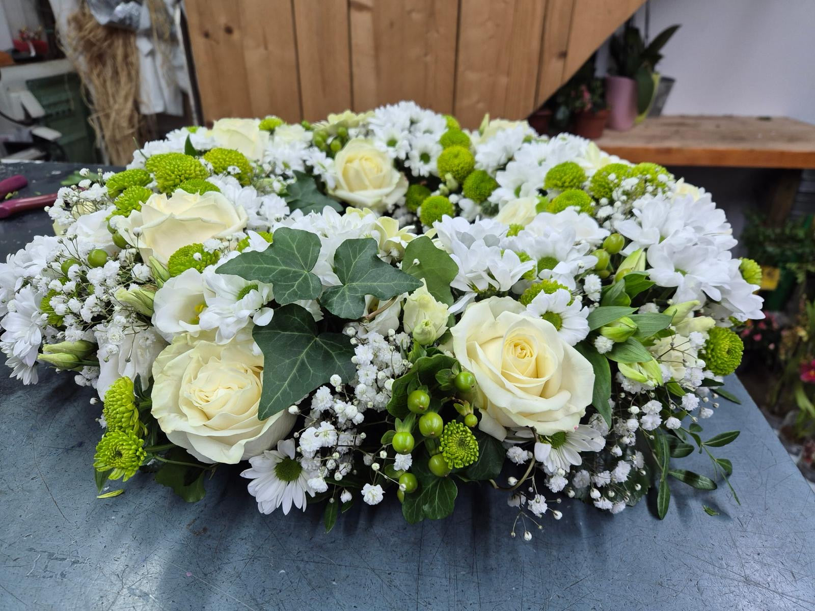 Couronne de deuil blanche et verte – Fleurs naturelles
